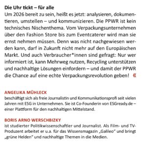 Angelika Mühleck und Boris Arno Werschbizky erklären in forum Nachhaltig Wirtschaften, Deutschlands reichweitenstärkstem Magazin für nachhaltiges Handeln, die Hintergründe und Auswirkungen der EU-Verpackungsverordnung. Als freie Redakteure schreiben die ESGready-Gründerin und der Journalist & Filmproduzent regelmäßig für das Fachmagazin.